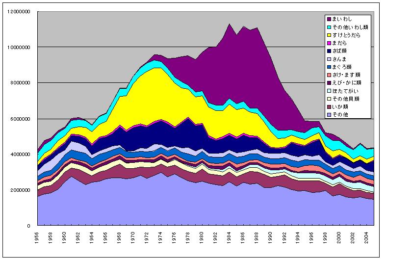 我が国の年間漁獲量は1980年代当時,世界1位を誇っていた(1988年まで).その内訳をみると,1970年代はスケトウダラ,1980年代はマイワ シの大豊漁に支えられたものであった.このうちスケトウダラの漁獲は,200海里体制定着によって外国水域からの撤退を余儀なくされたこと,それを補って 本格化したベーリング公海も1988年のベーリング公海漁業規則により減少,国内漁場での資源減少などにより,1970年代半ばから減少が続き,現在では 盛期の15分の1以下まで低下した.このスケトウダラの減少と同じ時期に,それまでほとんどとれていなかったマイワシが急激に漁獲を拡大し,1980年代 には,我が国の年間漁獲量のピークを迎えることになった.しかしその一方では,マイワシ以外の多くの魚種で,漁獲は一様に減少傾向を示していた.突然登場 したマイワシが1990年代に入って急激に減少すると,1970年代から続いていたマイワシ以外の魚種の漁獲減少が顕在化したのである.
