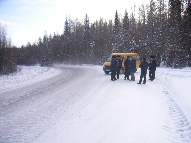 2008年1月に同地を訪問した時は,今度は“冬の道路“を使って,ガス・石油開発サイト(ベルフネチチョンなど)へのトラック輸送が盛期に なったところであった(写真下)。日によっては最低気温が-50℃を下回る環境であるが, これ が逆に幸いして,夏には湿地で無数の川が流れる原野が,凍結のおかげで通行できるようになる のである。この2年弱の期間で1,000kmオーダーの延長のパイプラインを完成させたことになる。しかも,未踏の凍土地帯を通してである。
